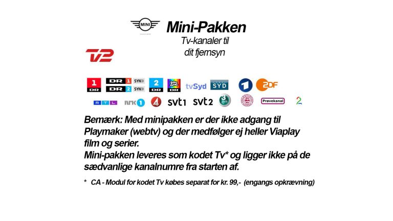 Skal du se dine tilvalgskanaler på TV skal du tilkøbe et CAM-kort som koster kr. 199,- (engangsudgift pr. TV)